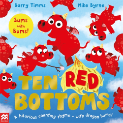 Count down from 10 with the red-bottomed dragons and do your 'sums with bums' in this hilarious storybook for preschoolers, which is a twist on the classic nursery rhyme Ten Green Bottles. Join the excitable little dragons in the castle as they chomp, chew, learn to breathe fire and fly, causing all kinds of mischief and mayhem. Packed full of silly humour and with lots to spot in busy scenes, this riotous rhyming story by Barry Timms and Mike Byrne is perfect for reading aloud and sharing together. With a surprise gatefold ending, a number line to count up to 10 and back down again plus a page of simple adding up, first maths skills have never been so much fun!